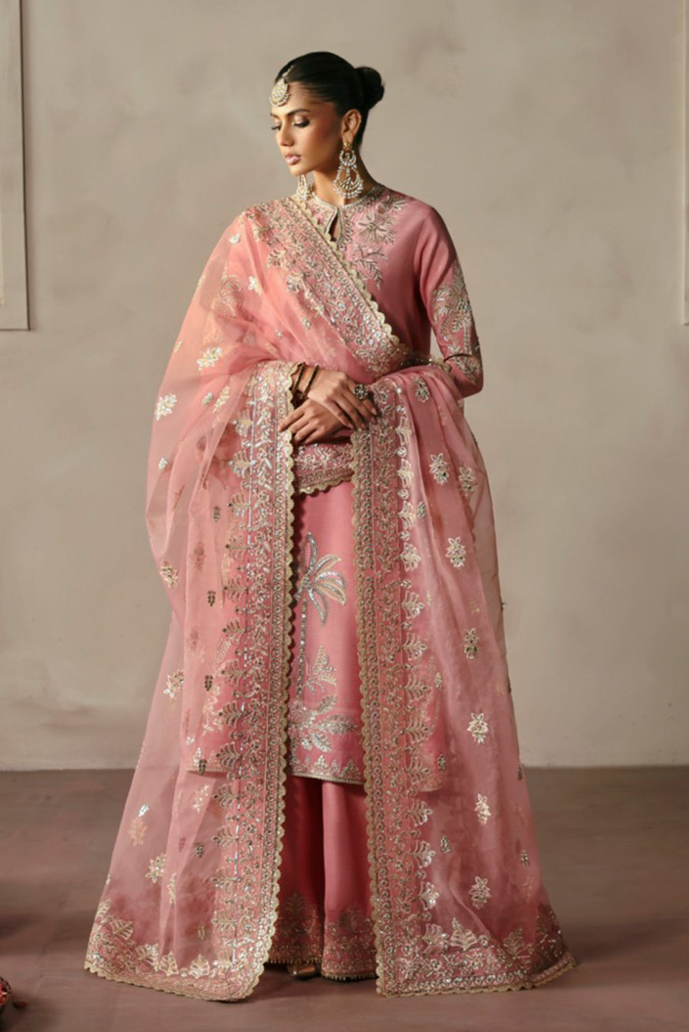 Gulrukh is a powder pink raw silk ensemble, a perfect fusion of elegance and grace. The shirt showcases a floral tropical theme, beautifully brought to life with intricate copper tilla, golden panni, and light gold sequins, adding a subtle shimmer and delicate charm. The outfit is completed with plain trousers featuring an embroidered border, balancing the richness of the dupatta. Ideal for festive occasions, this ensemble radiates sophistication with a touch of nature-inspired artistry.