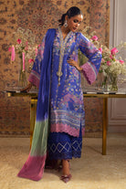 Crafted from exquisite pure raw silk in stunning shades of blue and lilac, this outfit showcases intricate zardozi embroidery along the neckline, embellished with pearls and gota. The hem is further enhanced by an embroidered panel. Accompanying this ensemble is a complimentary raw silk izaar, adorned with gota details and an embroidered panel at the hem. Additionally, the outfit is complemented by a luxurious ombre dupatta, culminating in a striking and unforgettable appearance.
