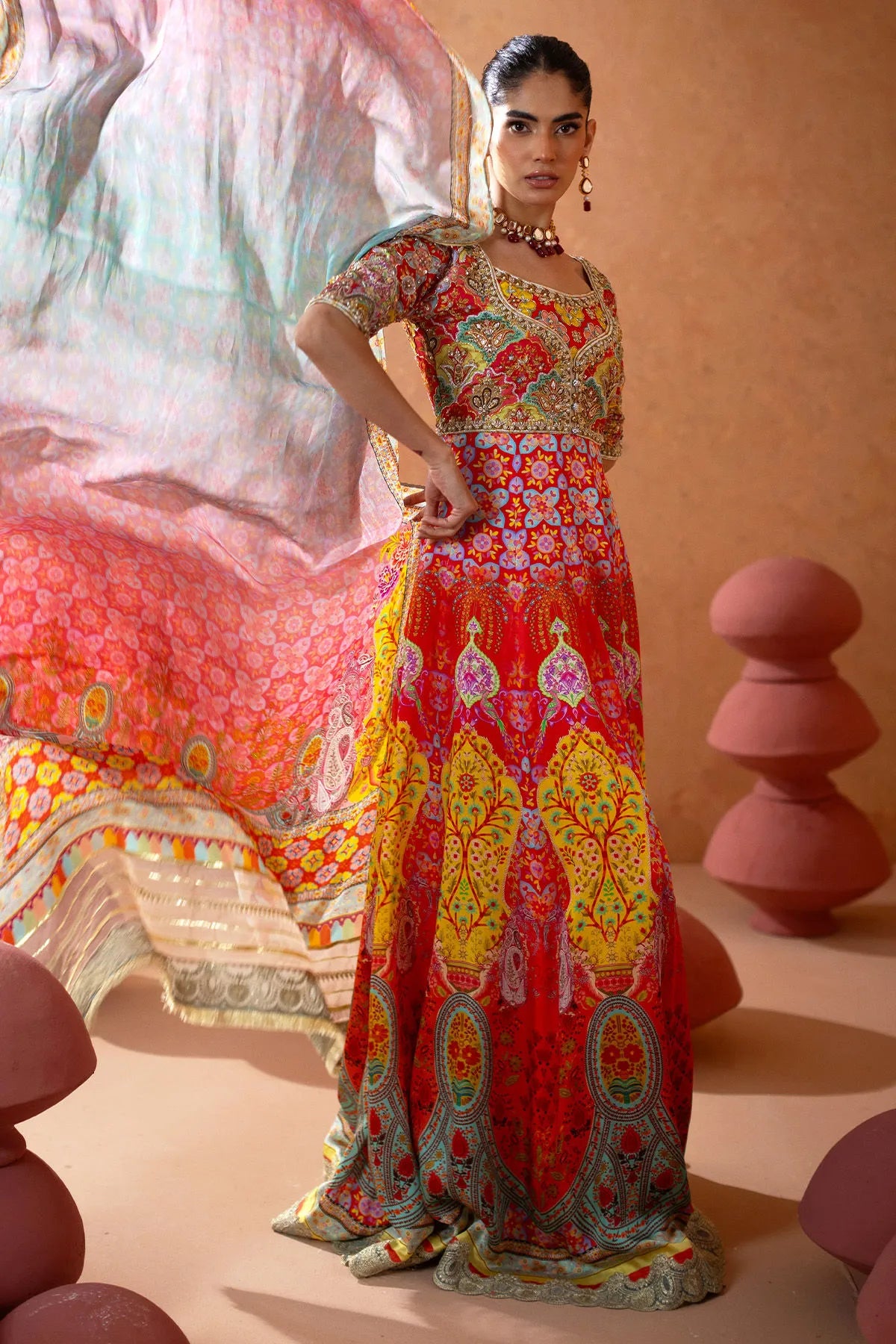 The floor-length Kalidar is presented in captivating shades of coral, sea green, and ochre, crafted from silk canvas. It showcases intricate zardozi embellishments on the bodice and sleeves. The centre back of the Kalidar is elegantly adorned with exquisite zardozi accents, highlighted by a deep-cut neckline. Accompanying the Kalidar is a silk printed dupatta, detailed with gota work on the panels. This Kalidar may be tastefully paired with matching straight-cut raw silk pants.