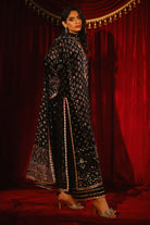 This elegant black discharge kurta set features a zardozi-embellished neckline and delicate handwork scattered throughout, enhanced with subtle gota details for a touch of shimmer. Paired with a medium silk izaar finished with gota edging and a matching discharge print dupatta, this ensemble strikes the perfect balance between timeless tradition and refined sophistication.