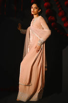 This powder pink velvet ensemble radiates timeless elegance with its embellished keyhole neckline, fitted embellished sleeves, and loop button details along the side vent. The back features organza panels with intricate embellishments, adding a graceful twist. Paired with embellished velvet Dhaka pants and a net dupatta adorned with Swarovski stone flower details, this look beautifully blends luxury, femininity, and modern charm.