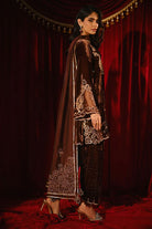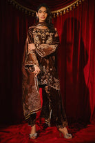 This mocha velvet ensemble exudes understated luxury with intricate zari appliqué adorned in fine zardozi handwork. It is paired with a complementing shalwar featuring gold spray sequins that add a soft shimmer. The organza dupatta, finished with velvet appliqué and delicate gota details, completes the look with a perfect balance of elegance and tradition.