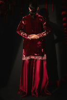 This striking magenta ensemble features a short front-open velvet jacket adorned with resham embroidery and intricate hand embellishments. The puffy sleeves add a touch of drama, while delicate floral and butterfly motifs bring a whimsical charm. Paired with flared sheesha silk pants, the look exudes contemporary elegance with a playful, feminine edge.