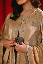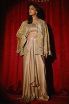 This beige ensemble features a front-open short velvet jacket adorned with exquisite hand embellishment in silver and gold tones. Delicate floral and bow-shaped embroidery, accented with gota, sequins, and cut dana work, adds richness and texture. Paired with a shamoos bandeau and a gracefully draped skirt, this look perfectly balances traditional artistry with modern elegance.