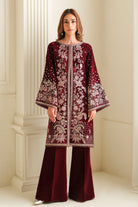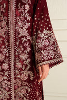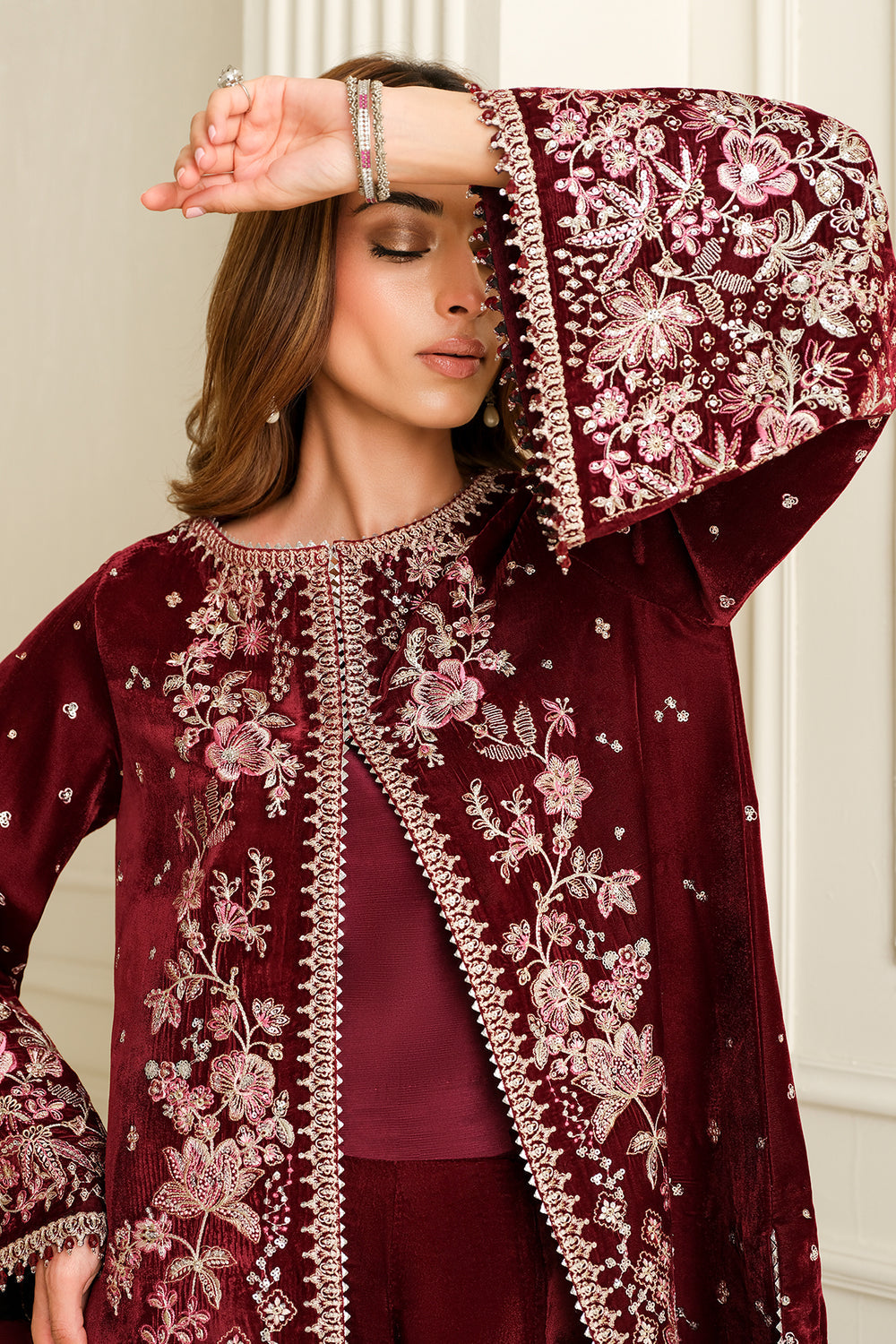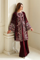 This outfit features richly embroidered velvet panels for the front and a cohesive back design, extending an opulent feel throughout the garment. The velvet neckline patch and extensive borders on the front, back, and sleeves underscore the ensemble's exquisite craftsmanship. A beautifully embroidered organza dupatta adorned with sequins and plush-dyed silk trousers complete this majestic attire.