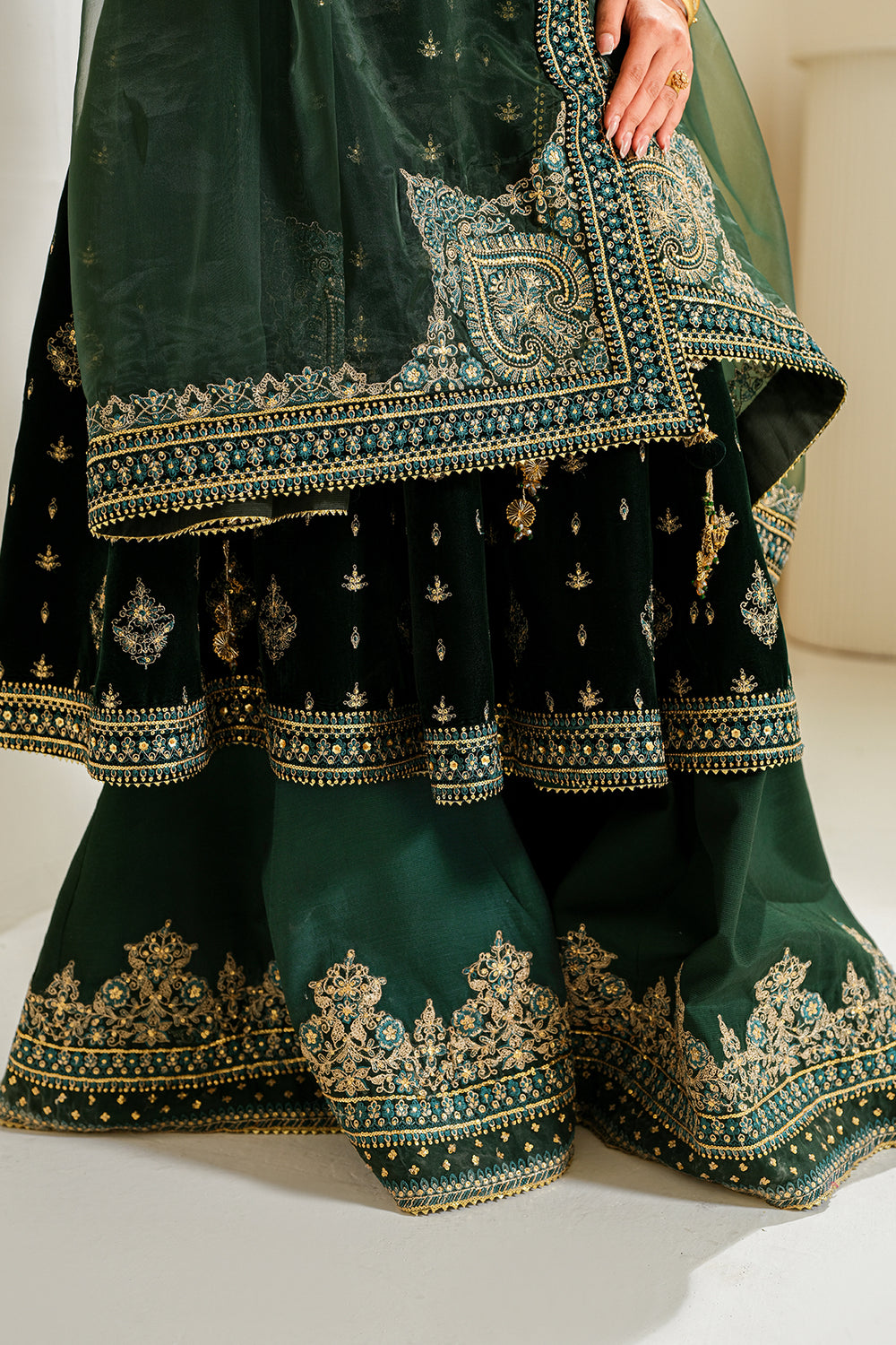 Fully embroidered organza, detailed with handmade tassels on all four sides, adding an element of luxury.