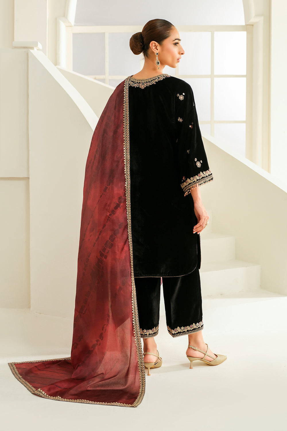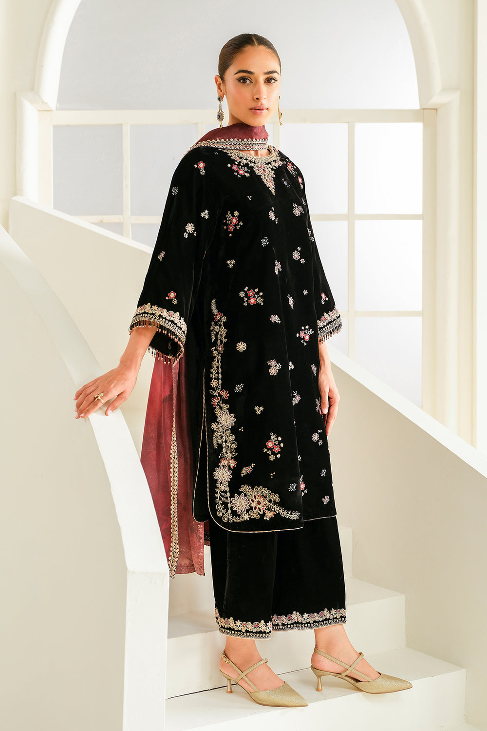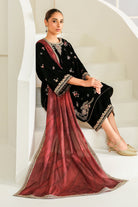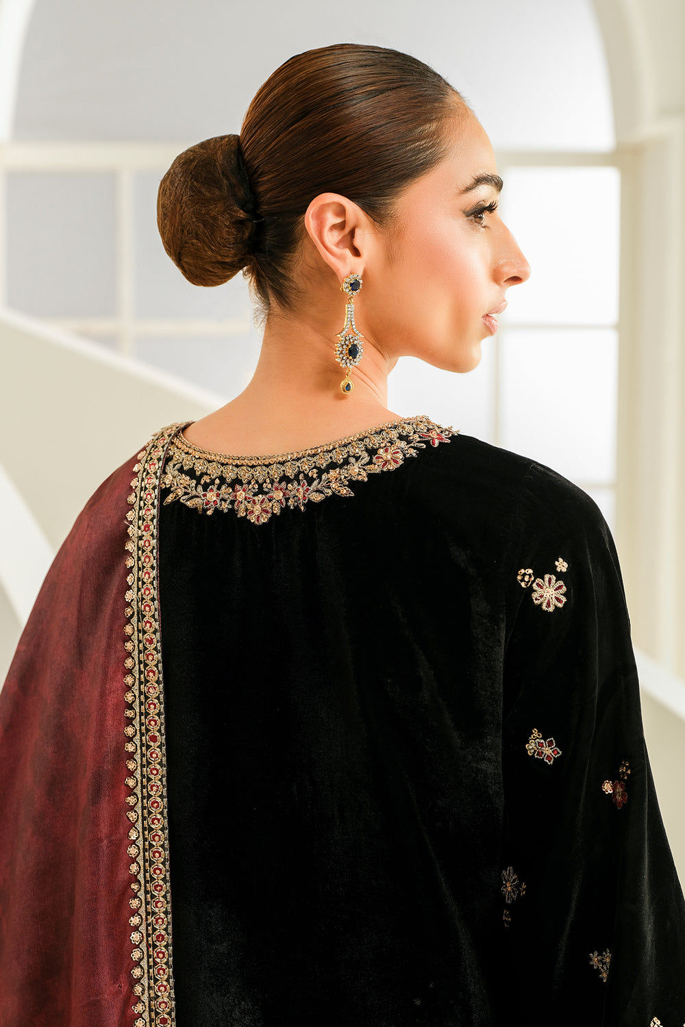 Craft your own masterpiece with this outfit featuring intricately embroidered velvet for the front, complemented by a plain velvet back. The neckline is hand-embellished. The sleeves and printed silk dupatta borders boast ornate embroidery, which can be tailored to create an exquisite garment that showcases detailed craftsmanship and luxurious materials.