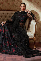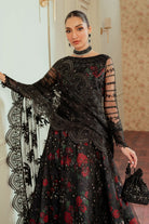 Accompanied by a net dupatta edged with a delicate border embroidered & embellished with silver sequins, offering a subtle contrast against the darker elements of the ensemble.