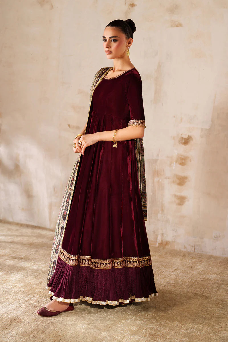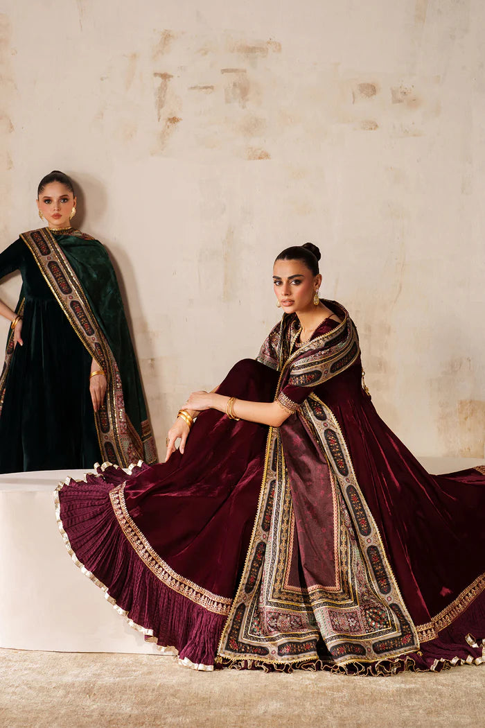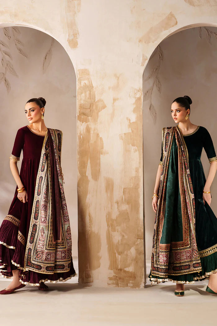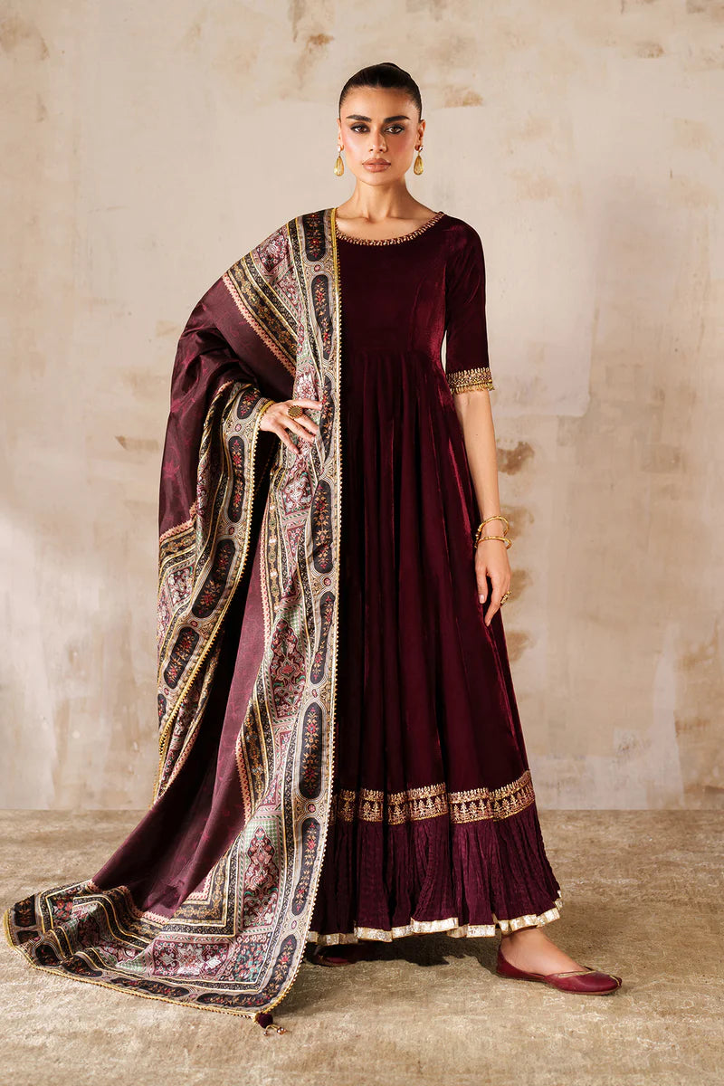 Elevate your wardrobe with this stunning three-piece ensemble featuring exquisite craftsmanship. The frock showcases luxurious embroidered velvet detailing on the neckline and sleeve borders, creating an elegant focal point. Paired with comfortable grip trousers for all-day wear, this set includes a beautifully digital-printed silk dupatta that complements the overall aesthetic. Complete with coordinating accessories, this collection brings together premium fabrics and thoughtful design for a polished, sophisticated look.