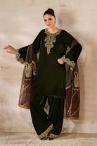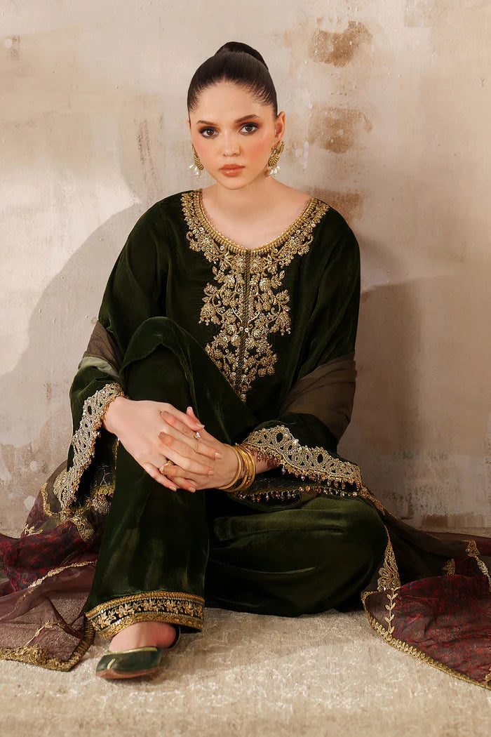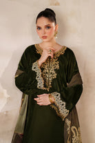 Elevate your wardrobe with this stunning three-piece ensemble featuring luxurious embroidered velvet craftsmanship. The shirt showcases intricate hand embellishments at the neckline, paired with a matching velvet shalwar for a cohesive, sophisticated look. Complete the outfit with a digitally printed chiffon dupatta adorned with an embroidered border that adds graceful movement and dimension. This comprehensive set includes all pieces plus accessories, making it perfect for special occasions or celebrations where you want to make an elegant statement.