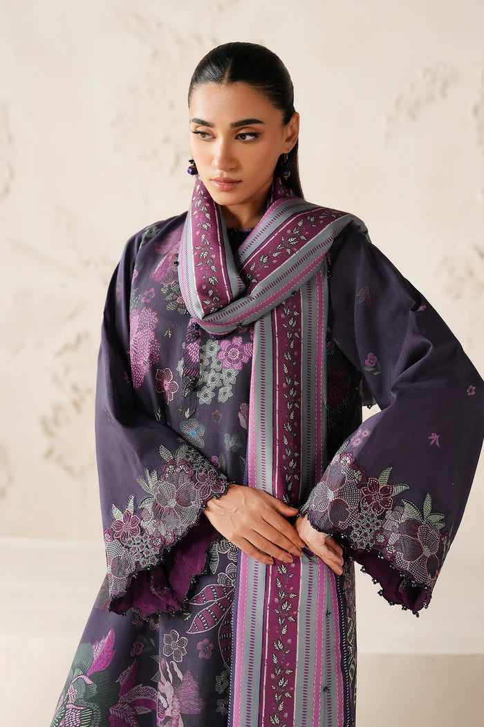 This elegant set features a digital printed viscose silk shirt paired with matching trousers, offering both comfort and style. The embroidered organza sleeves border adds a delicate, refined touch. Complemented by a digitally printed viscose shawl, this ensemble effortlessly combines traditional craftsmanship with modern design for a graceful look.
