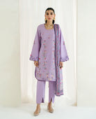 A short length three-panelled lilac shirt, beautifully tailored to create a graceful flow, featuring a harmonious blend of pinks, yellows, and greens brought to life through ribbon embroidery. The design is elevated by a scallop-shaped neckline, adding a soft, feminine touch. It is paired with plain trousers in a coordinating shade, allowing the shirt to remain the focal point. The look is completed with a printed floral Dupatta that echoes the shirt’s color palette, tying the ensemble together with elegance.