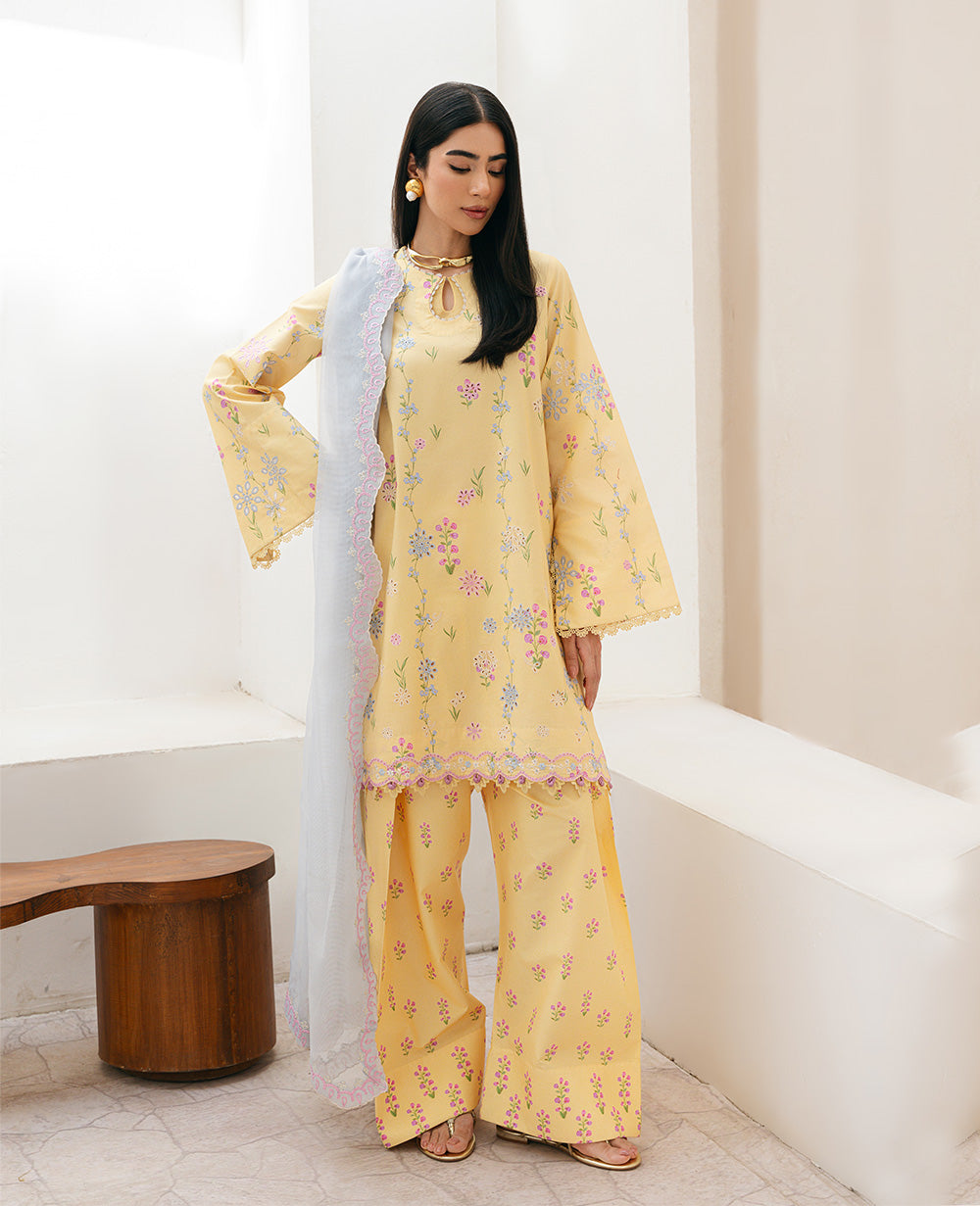This effortlessly elegant ensemble features a short-length printed shirt adorned with delicate schiffli running embroidery, creating a beautiful harmony between texture and print. The design is elevated by a graceful keyhole neckline, finished with sheer organza detailing that adds a subtle, refined touch. Paired with a flowing farshi shalwar, the silhouette exudes traditional elegance with a contemporary edge. Completing the look is a contrasted dusty blue dupatta, intricately designed with a woven border and a finely scalloped hem. The dupatta features detailed craftsmanship along all four sides, adding depth and a touch of softness that complements the entire outfit.