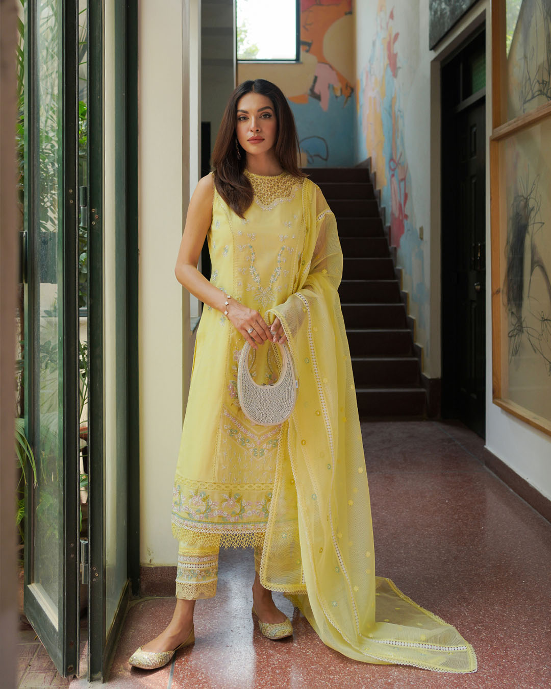 Radiant hues and dazzling details make Neomi a one-of-a-kind piece. Crafted from soft slub viscose, the sumptuous pastel yellow shirt radiates regality with its melange of pearl, resham and cutdana embellishments. Paired with an embroidered lawn trouser and an embroidered jute net dupatta, this ensemble totally deserves a spot in your wardrobe.