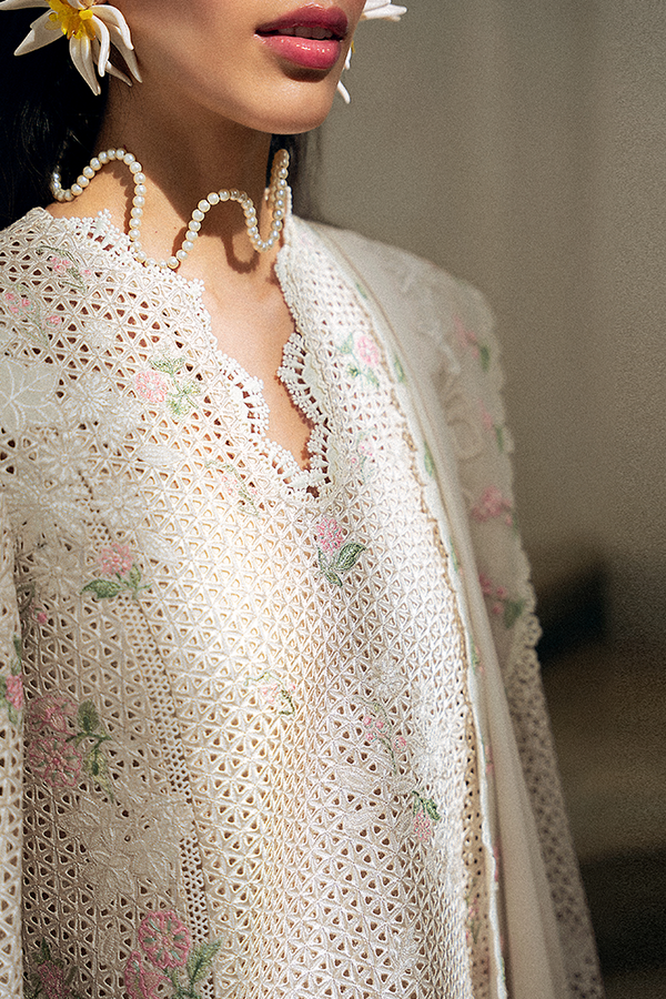 Cutwork ivory lawn shirt, with chiffli base and floral patchwork in soft pinks and pastel green merged with the solid ivory flower motifs. Bell sleeves with lace detail and embroidery. Close to neck scoop neckline with scalloped lace detail. It comes with a complementary ivory floral slip.