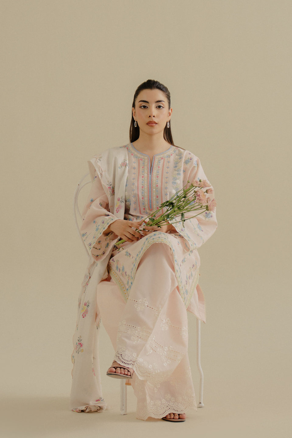 The peachy pink jacquard, paired with a jacquard dupatta and composed embroidery, creates a soft yet sophisticated look with intricate detailing.
