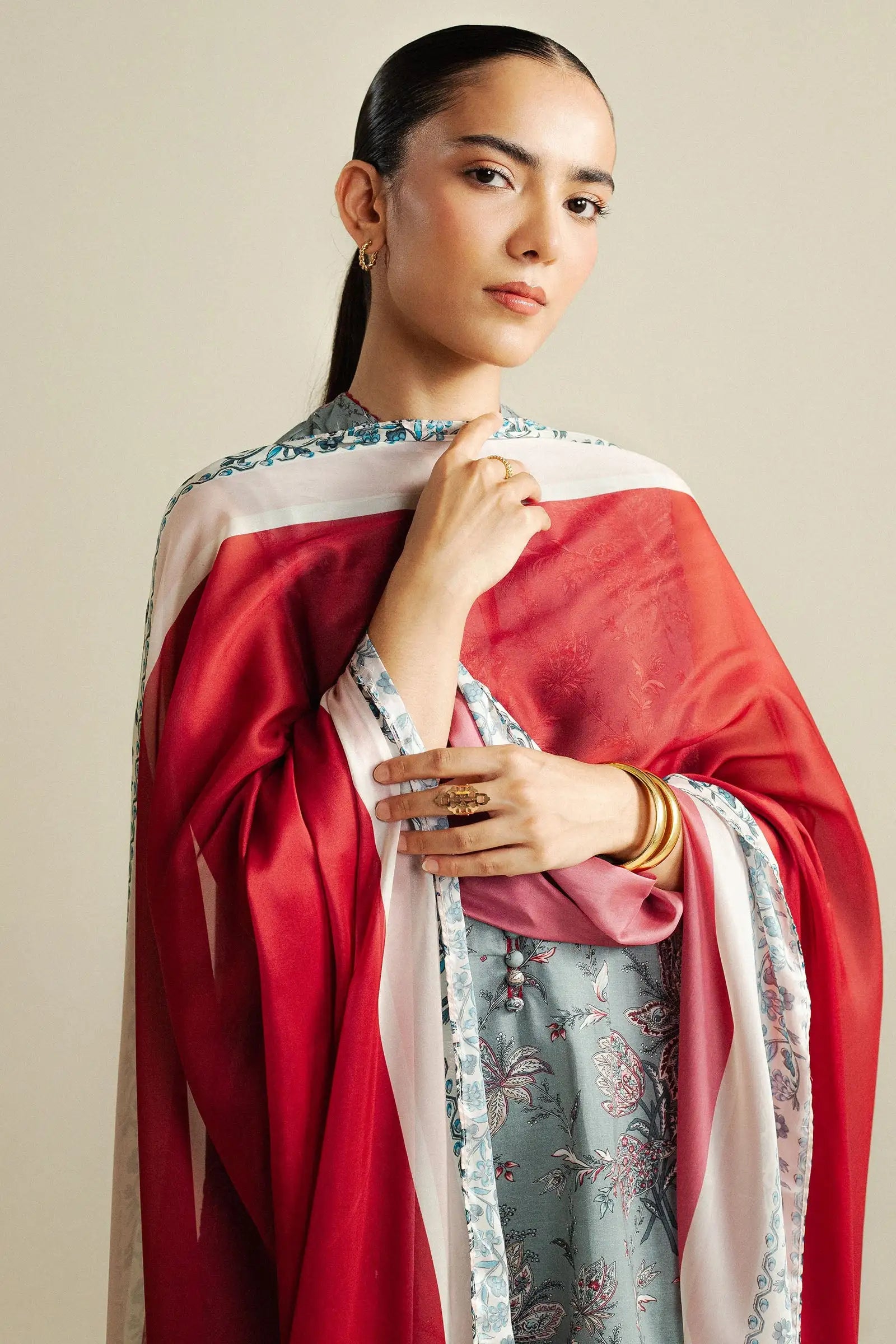 A cool stone blue shirt paired with a printed trouser and a deep red wine dupatta, blending serenity with bold sophistication.
