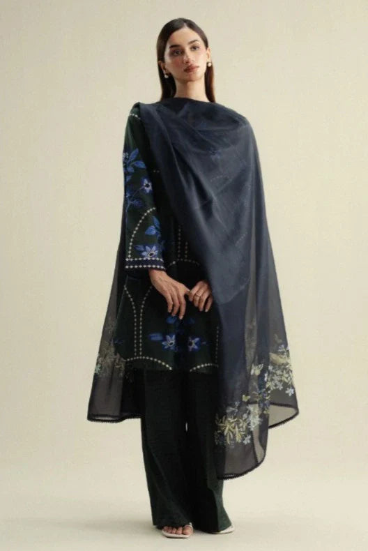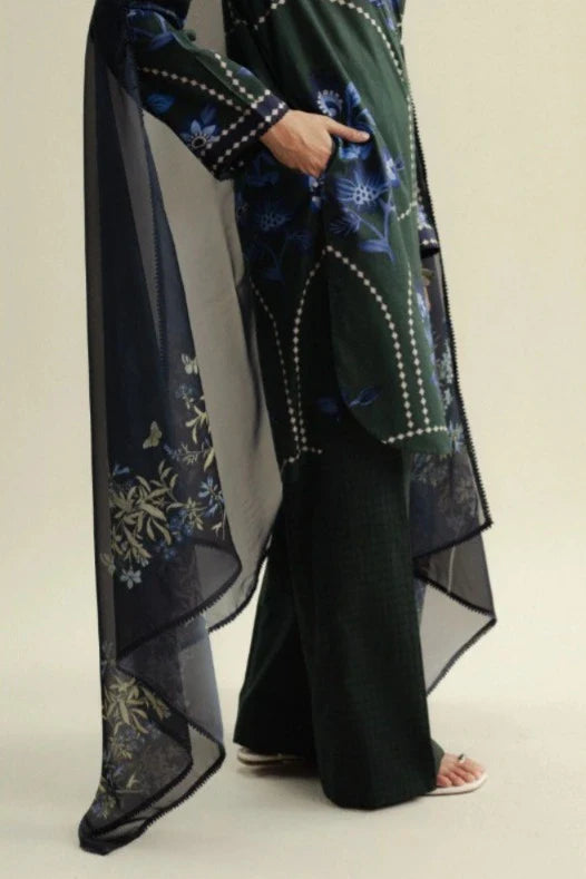 A rich emerald green shirt layered with blue monotones, paired with a plain trouser and completed with a matching dupatta for bold tonal harmony.