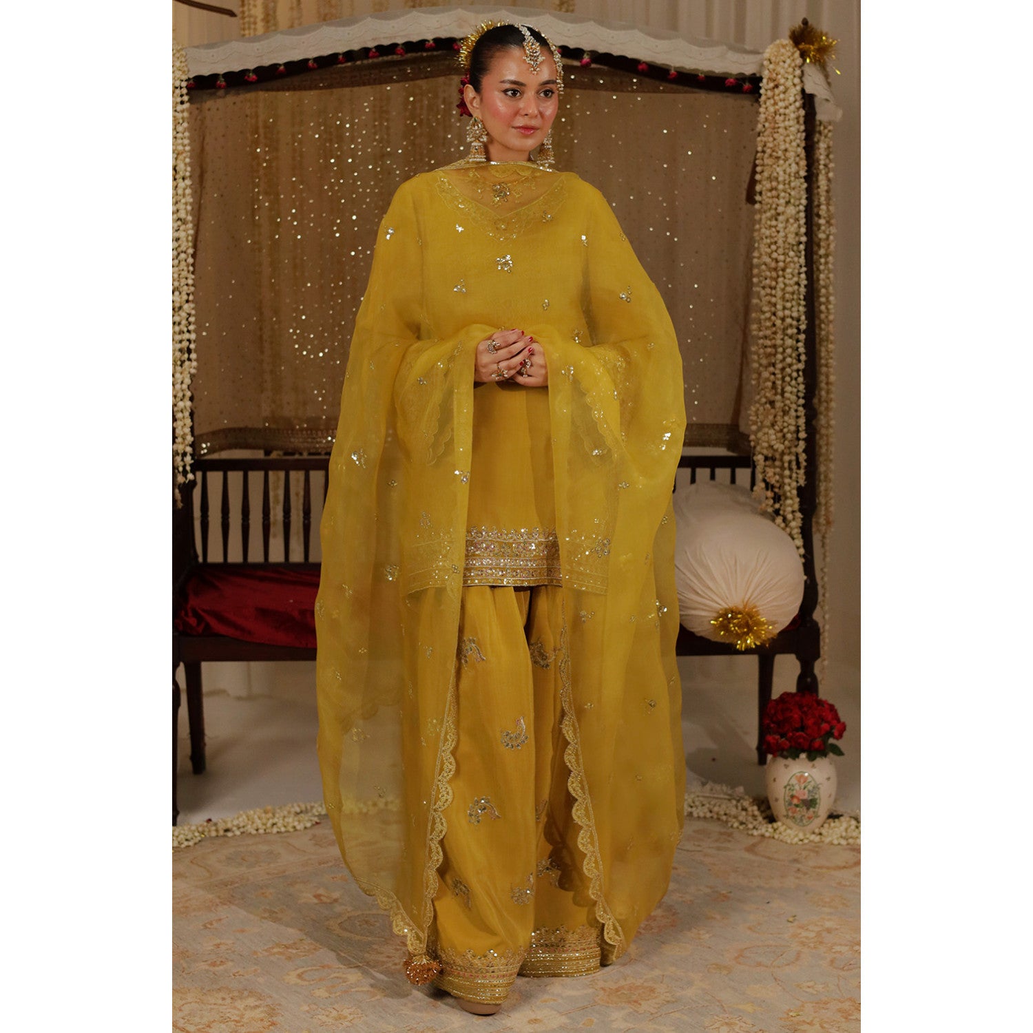 Butterscotch yellow bamber silk shirt and farshi shalwar with tilla, resham and sequin embroidery paired with an organza dupatta.