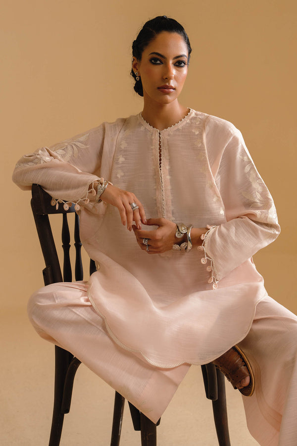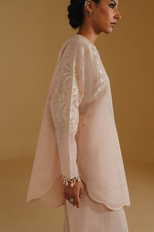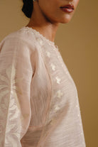 Soft as a fleeting monsoon breeze, Haya is rendered in a muted powder pink — serene, delicate, and effortlessly refined. Crafted from feather-light fabric, the silhouette drapes with ease, echoing the Élan woman’s natural grace and quiet strength.