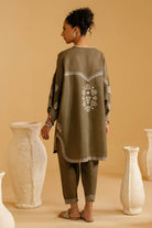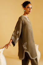 Cut in a relaxed, fluid silhouette, the outfit is composed in breathable woven fabric that drapes with ease, designed to move with the body and breathe with the season. Paired with tonal pants, also subtly adorned with delicate stitch detailing, Zarmin becomes a portrait of quiet resilience — thoughtful, poised, and endlessly refined.