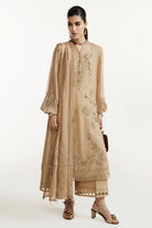 Borders, delicately encrusted with intricate embellishments, frame the silhouette with a quiet, regal allure. Billowing, gathered full-length sleeves and impeccably cut culotte-style trousers lend a sense of weightless fluidity, effortlessly mirroring the grace of its wearer. A diaphanous cotton net dupatta, edged with finely embroidered borders, completes this vision of ethereal sophistication—an emblem of Élan’s signature elegance, designed for the woman who moves through the world with an aura of timeless magnificence.eauty.