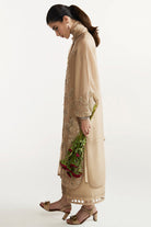 Élan Eid Formals presents Nuit Céleste – A celestial reverie, draped in the luminous glow of an ethereal mocha sable hue. This resplendent creation is a masterclass in opulence, where every detail is a testament to exquisite craftsmanship. The impeccably tailored long shirt is adorned with luminous hand-embroidered florals, each glistening thread artfully woven to catch and refract light, evoking an air of celestial grandeur.