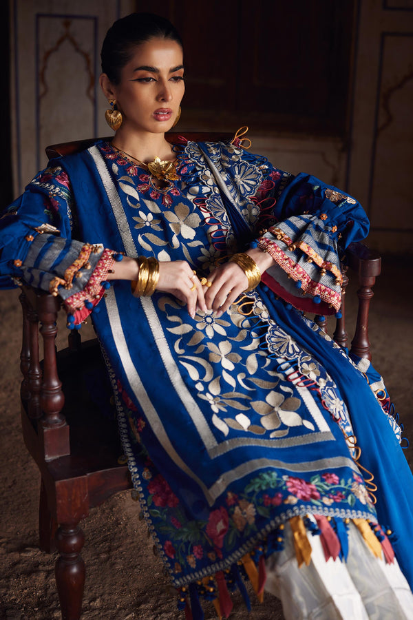 Soft, detailed embroidery graces the neckline and sleeves, enhancing the piece’s rich textures and creating a harmonious dance of craftsmanship. The tonal voile dupatta, adorned with vivid floral scalloped borders and finished with playful tassels, adds gentle movement and an air of sophistication to the ensemble.