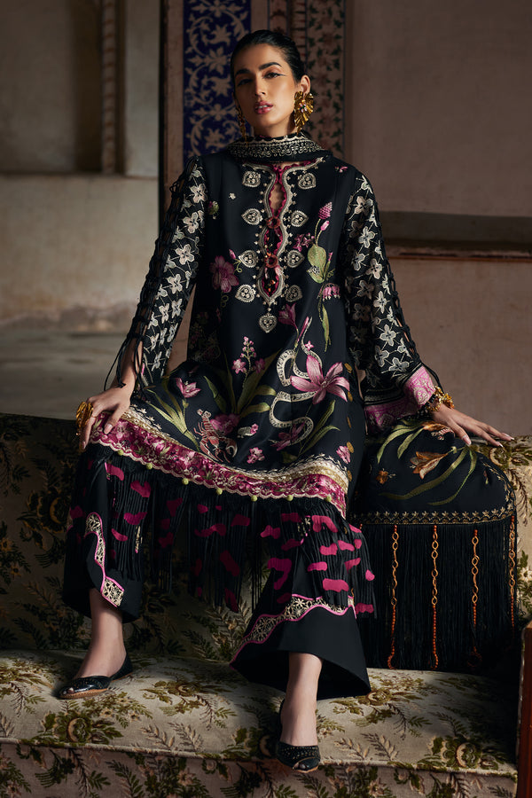 An ode to the night, Azureh unfolds on a deep black canvas—where ethereal artistry meets the mystery of the night’s allure. Lush embroidery in soft ivory, blush pink, and verdant tones conjures a whimsical floral garden in full bloom.