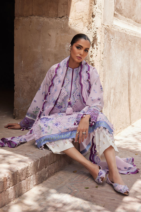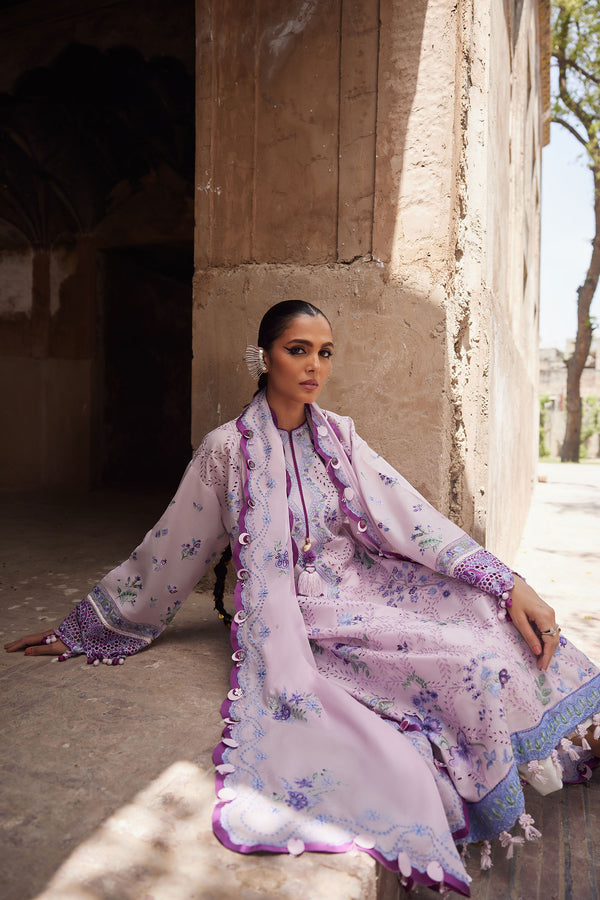 Amara effortlessly merges timeless craftsmanship with contemporary style in Élan Lawn '25. Set against a soft seafoam canvas, this design blooms with bold floral embroideries in periwinkle, berry, lilac, and blue, each motif bringing a fresh, vibrant twist to classic artistry. Thoughtfully placed shell and bead embellishments add a touch of refinement while maintaining a modern edge.
