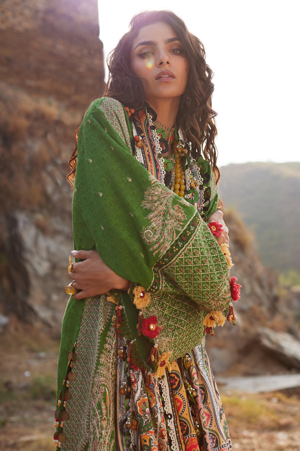 Cora’ bursts with untamed elegance, as delicate florals explode across its scheel green canvas. The jacquard shirt, adorned with intricate kashmiri stitching and bold tribal motifs, ignites in fiery shades of burnt orange and powder yellow, effortlessly merging with the soft undertones of sage and ivory. This design knows no boundaries—porcelain vines and tendrils rise fearlessly, spiraling toward the shoulder in a breathtaking, unapologetic flourish. Detailed paisleys on the sleeves bring a sharp edge, delivering an oomph that demands attention. The sumptuous silk dupatta completes the ensemble, flowing with wild grace, creating an ethereal yet fearless masterpiece. This is not just an outfit—it’s a fierce statement, embodying the wild, untamed spirit of Élan Winter.