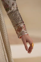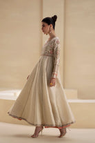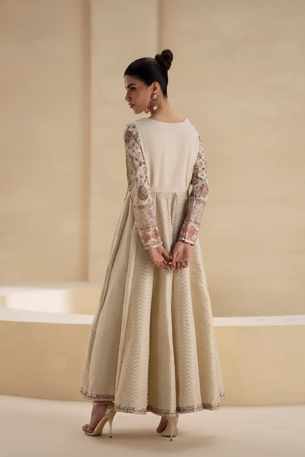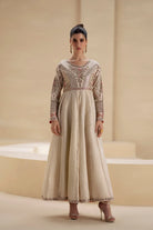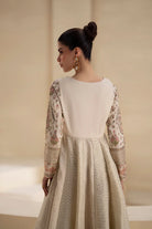 Command attention with this absolutely breathtaking ivory embroidered dress. This floor-length gown features a voluminous, floor-sweeping silhouette, crafted from raw silk fabric with a subtle overall gold-toned pattern that catches the light. The fitted bodice and sleeves are lavishly embellished with dense pink, silver, and gold thread embroidery, featuring delicate floral motifs and traditional patterns that exude majestic grandeur. Perfect for a formal evening or wedding reception, this dress is a true masterpiece of textile artistry.