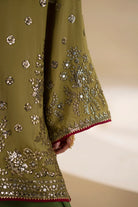 Dazzle with opulence in this magnificent moss green embroidered suit. The straight-cut shirt is crafted from a subtle green fabric and is extravagantly adorned with heavy silver and gold sequin work, scattered across the entire bodice and sleeves. The neckline features elaborate beading and tassel details, while the wide, full-length sleeves are finished with a rich border. The ensemble is elevated by contrasting dark green shalwar. The shalwar boast a heavy, ornate border of gold and sequin embroidery at the hem, creating a regal and balanced silhouette. A deep pink, richly woven dupatta with gold borders completes this luxurious look, making it a perfect statement piece for formal or wedding festivities.