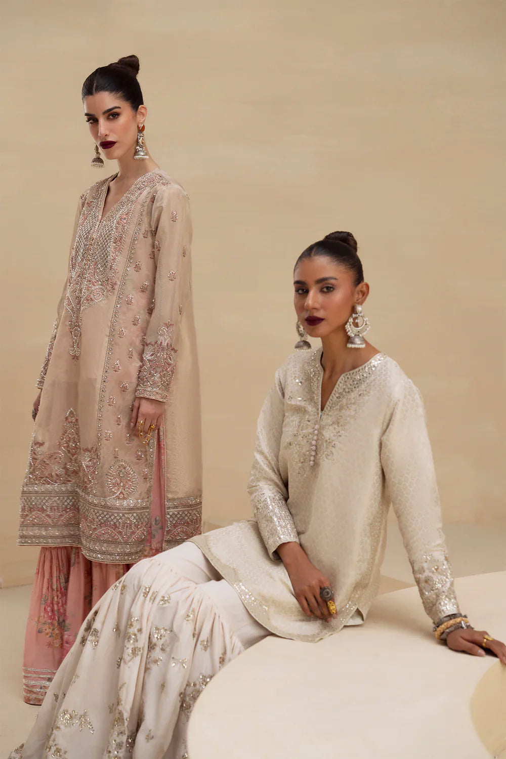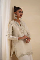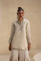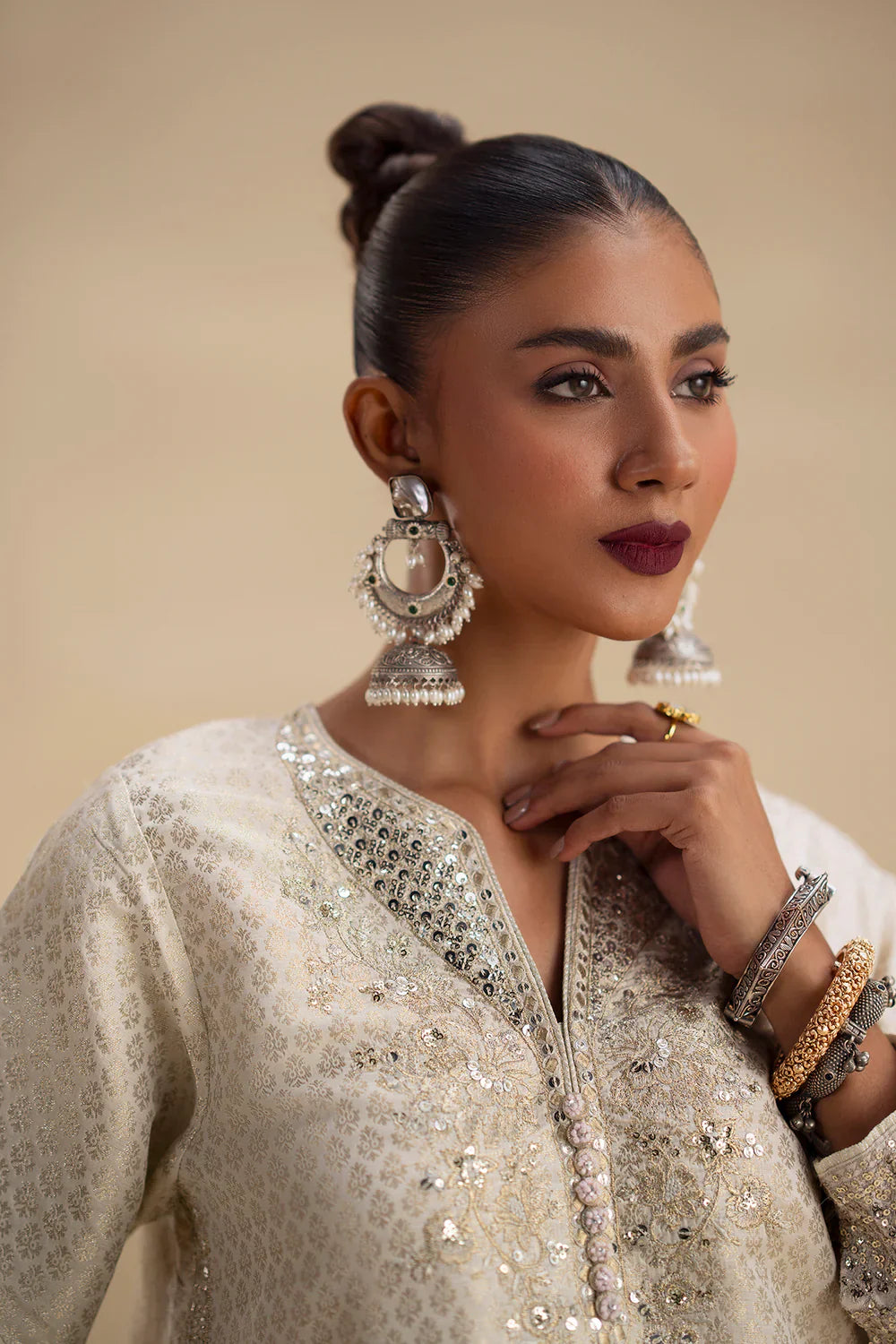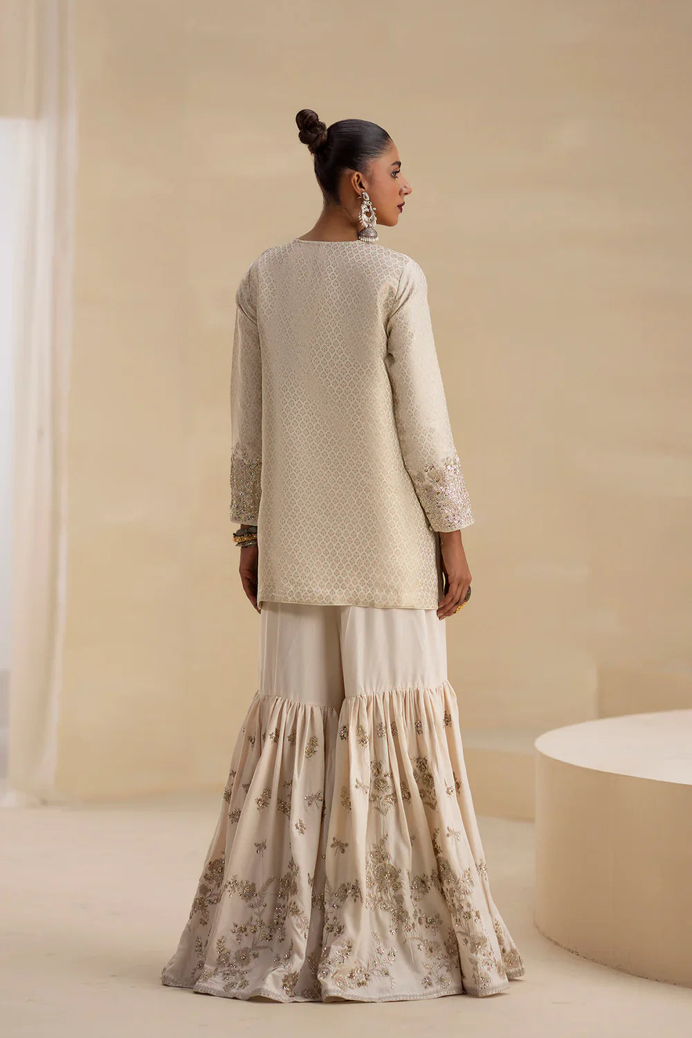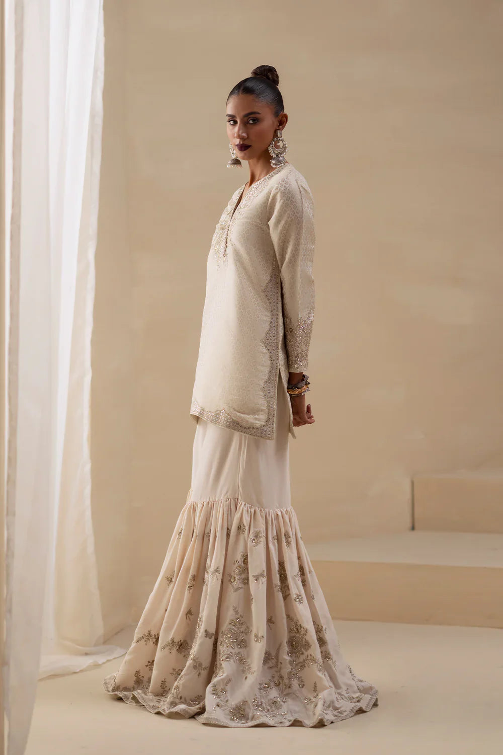 Illuminate the evening in this exquisitely detailed ivory embroidered suit, featuring a short shirt and a magnificent gharara. The straight-cut shirt is crafted from a luxurious off-white fabric with a subtle tonal woven pattern and features a deeply flattering V-neckline. The bodice and full sleeves are richly embellished with intricate gold and silver embroidery and sequin-work, giving it a luminous, festive appeal. The ensemble is completed by a voluminous gharara in a coordinating cream beige hue. The lower tier of the gharara is adorned with delicate, ornate gold thread embroidery and sequin work, creating a majestic, flared silhouette that is ideal for formal weddings or celebratory occasions.