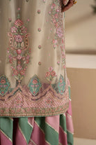 Channel ethereal majesty in this stunning ivory embroidered suit. The ensemble features a long, flowing shirt crafted from sheer net fabric, which is lavishly embellished with intricate pink, gold, and turquoise threadwork and bead detailing across the yoke and full sleeves. The detailed embroidery continues down the length of the shirt in ornate floral and paisley borders. Layered beneath is a slip and a magnificent flared gharara with striking horizontal stripes in complementary shades of pink and green, creating a voluminous and contemporary silhouette. This suit is a regal and unique choice for high-end formal or wedding events.