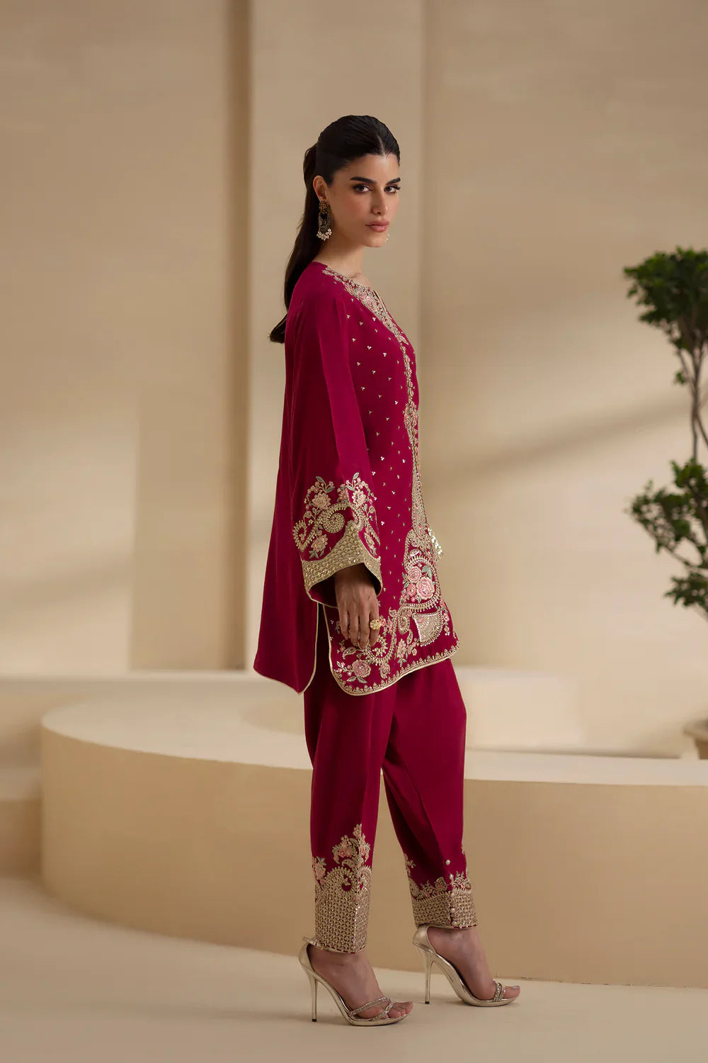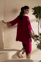 Channel timeless glamour in this breathtaking magenta embroidered suit. The relax fit kurti is crafted from a rich, deep magenta fabric and is lavishly adorned with heavy gold and silver thread embroidery. The embroidery features magnificent paisley and floral motifs running down the center front, along the hem, and gracefully decorating the sleeves. The ensemble is perfectly completed by coordinating shalwar in the same vibrant magenta hue. The hem of the shalwar boast a striking, heavily embroidered border, making this regal monochromatic look ideal for formal occasions and celebratory evenings.