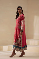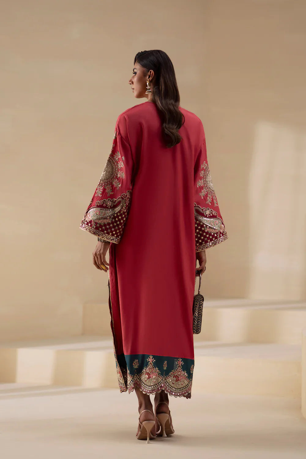 Channel imperial elegance in this beautiful deep coral-pink embroidered shirt. This maxi-length shirt features a flattering V-neckline and a straight, flowing cut. The entire shirt is richly embellished with intricate gold, silver, and pink thread embroidery and shimmering sequin work. The full sleeves are adorned with ornate traditional motifs. A striking contrast is introduced at the hem with a wide band of deep teal fabric featuring bold embroidery, creating a dramatic finish. This luxurious piece is the ultimate statement for any grand formal or wedding celebration.