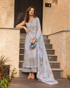 A realm defined by the seamless fusion of elegance and modernity, Liana brings forth the brilliance of threadwork on an embroidered lawn canvas. The dusty blue lawn shirt features lavish organza and net patches and is complemented with a digitally printed dupatta. This set comes with Cambric trousers for a look that feels pretty, playful and summer ready.