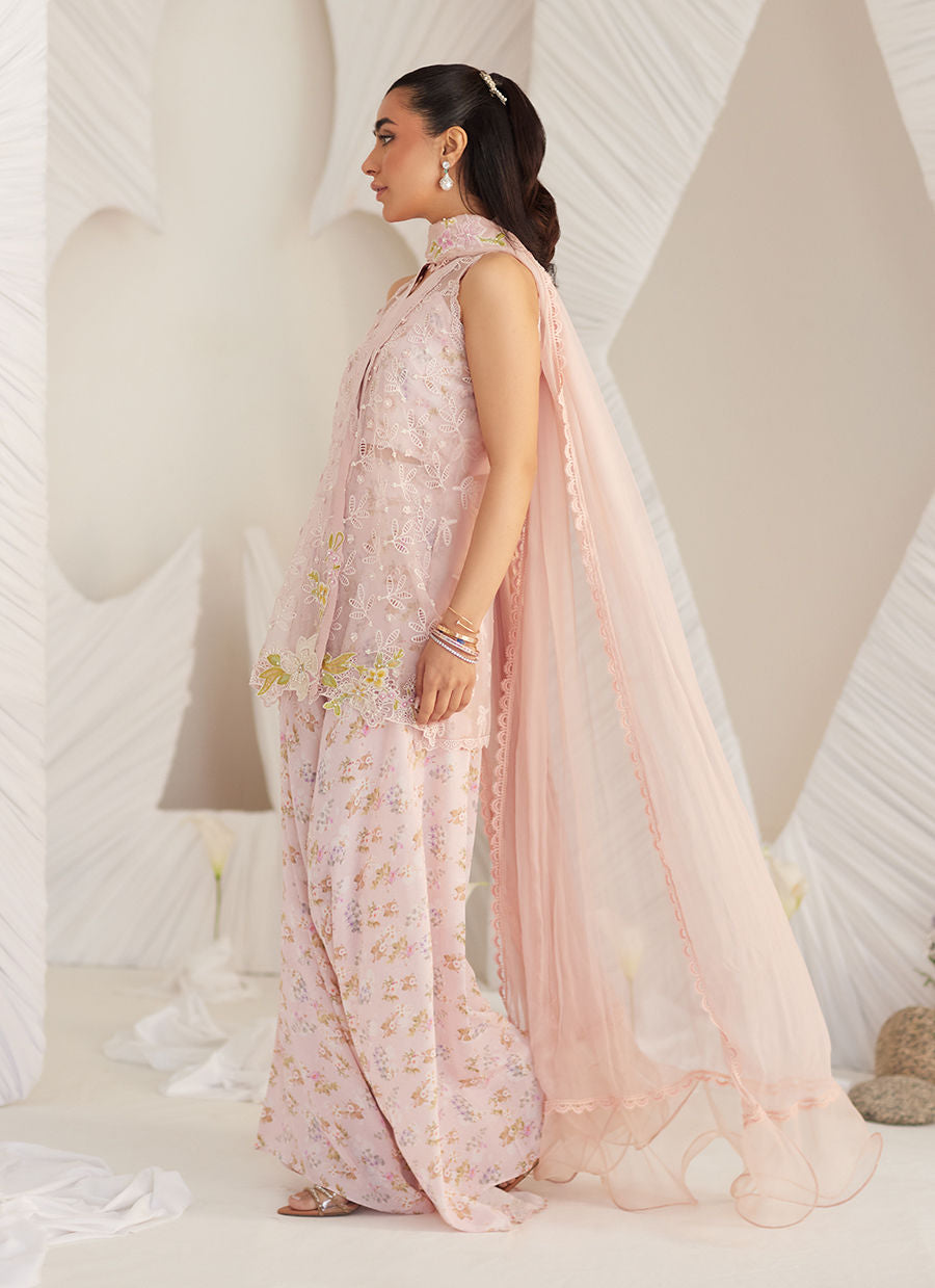 The mesmerizing jacket cut from pure organza in a blush pink is decorated with cut work botanical motifs all over is further uplifted with meticulously hand embellished pearls, Swarovski crystals, sequins and 3D flowers. The striking, translucent jacket is layered over a forever flattering, printed bustier.