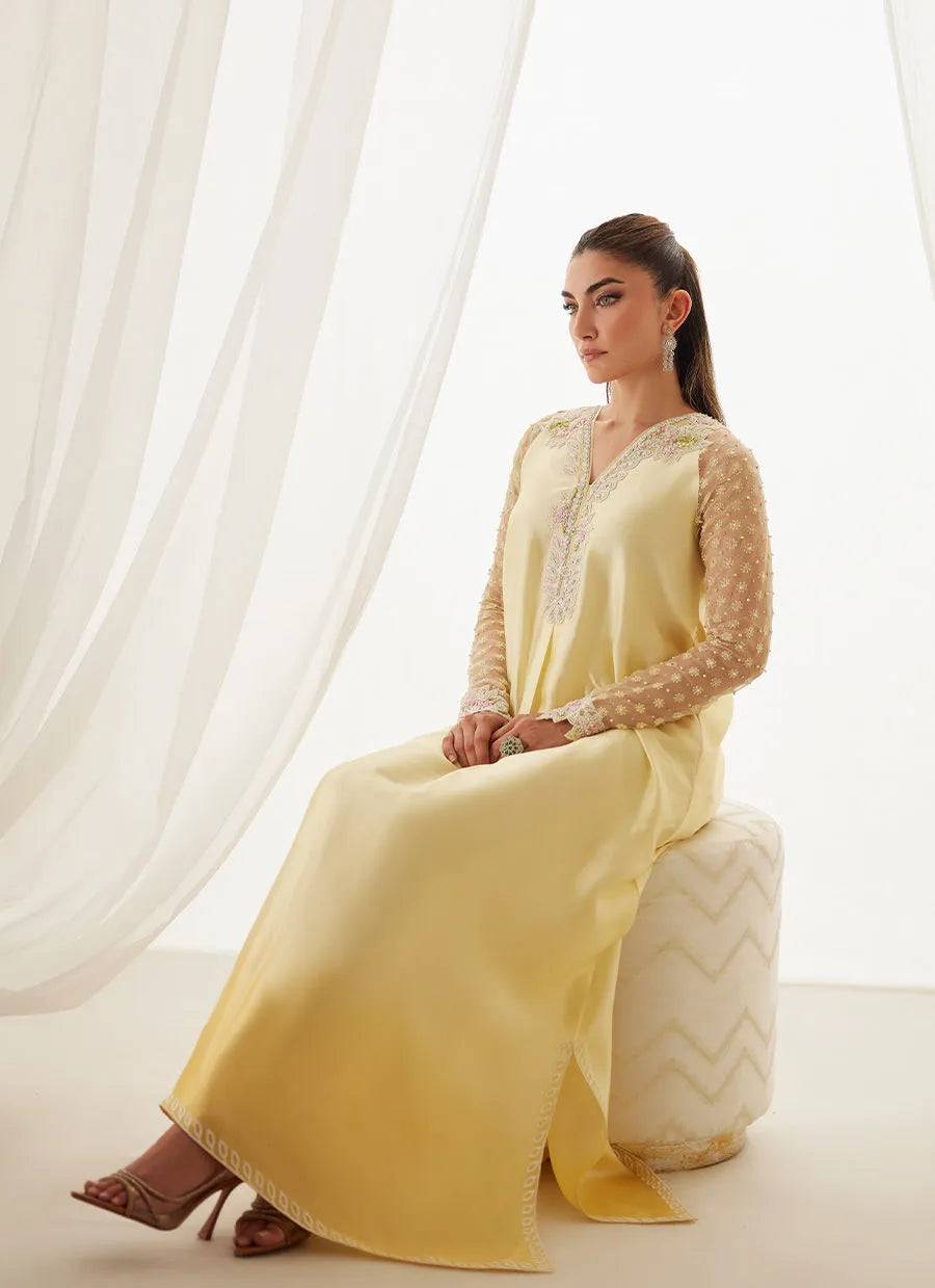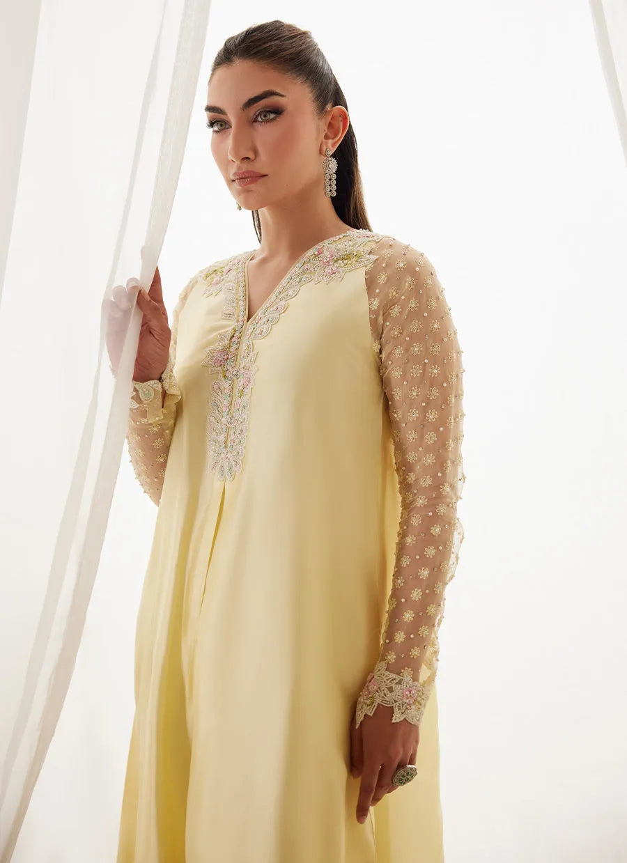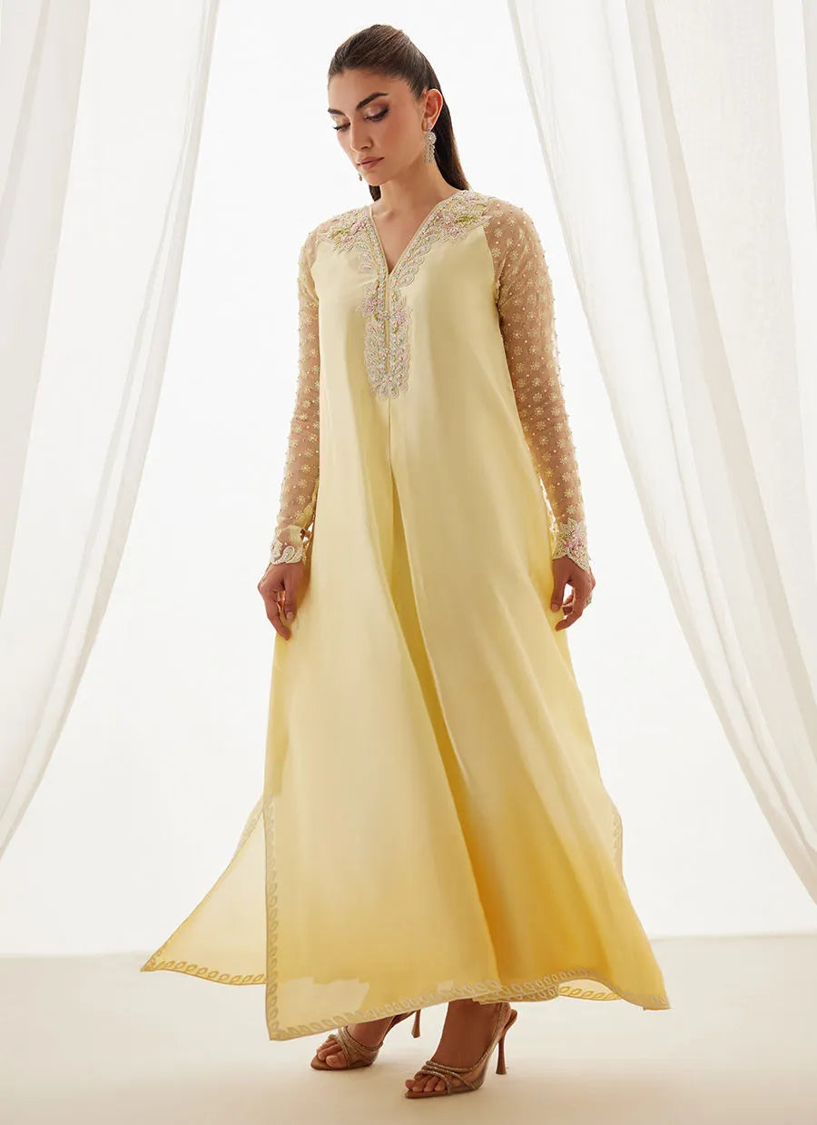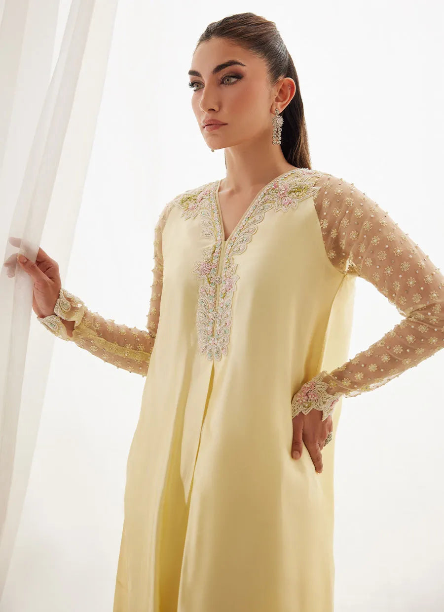 The modern embroidered neckline and sleek, statement sleeves — crafted from embroidered organza and finished with whimsical pearl tassels — bring a playful yet refined drama. Paired with pure silk pants and sparkly heels, this is your go-to for brunches, teas, or dinners where chic ease is non-negotiable.