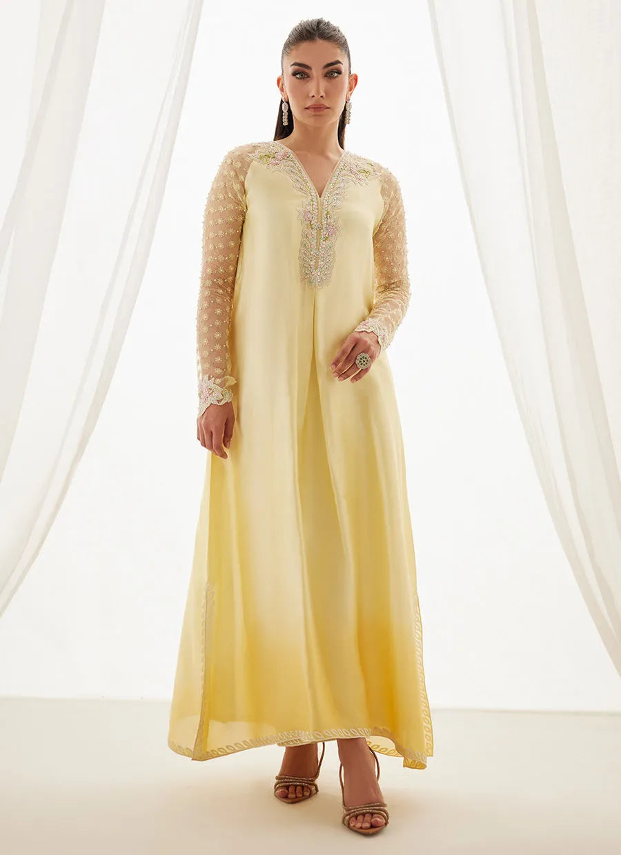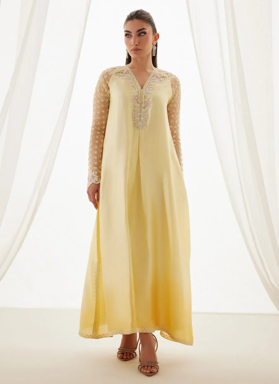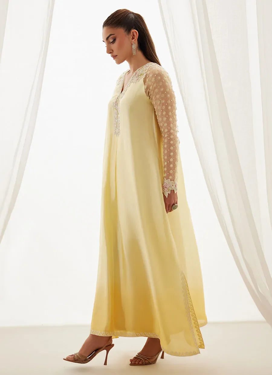 A vision pale lemon, this flowing shisha silk shirt fades seamlessly into a deeper, buttery hue for striking dimension.