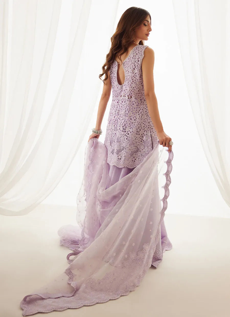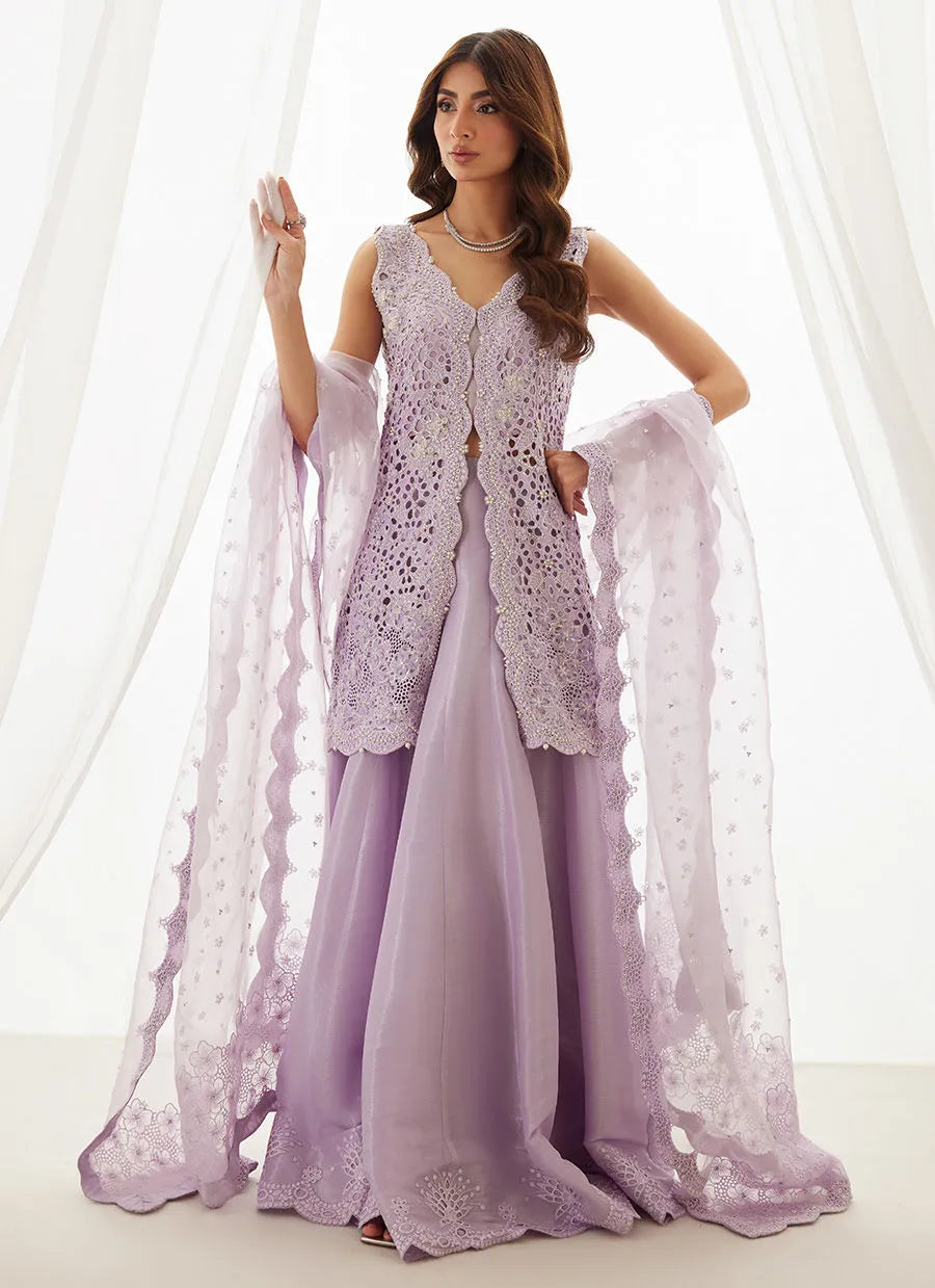 A delicate interplay of lavender and silver — this front-open raw silk shirt features scalloped cutwork borders, adorned with pearls and 3D florals for a touch of romance.