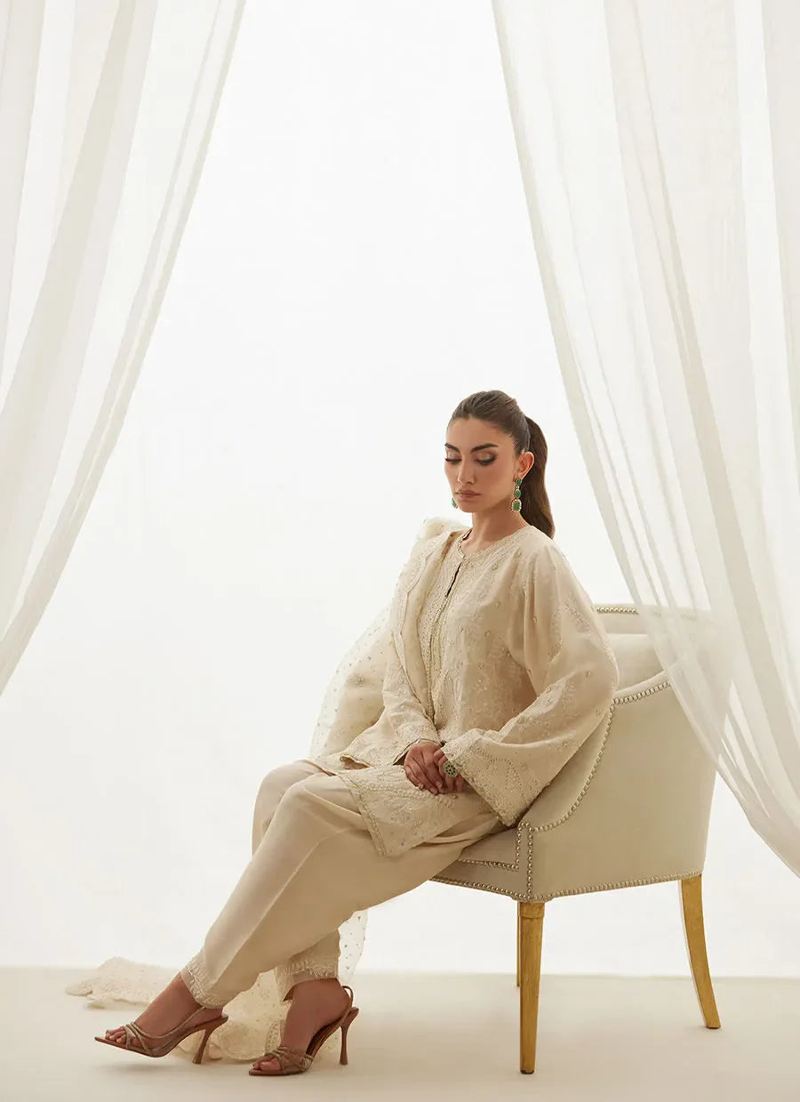 Refined yet striking — an ivory raw silk shirt, intricately embroidered and hand-embellished, pairs with a tailored shalwar accented by delicate embroidery.