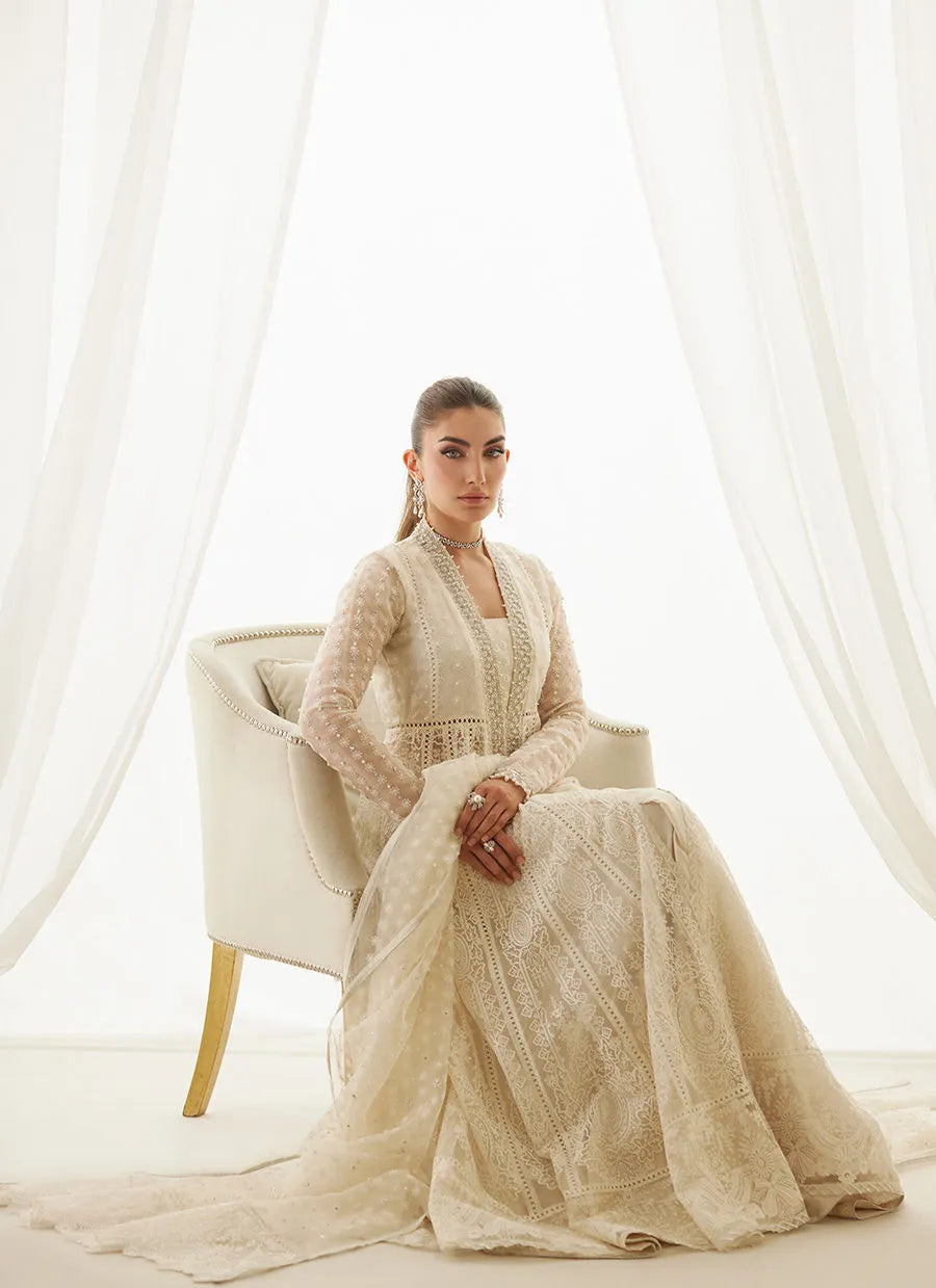 The neckline, patti, and sleeve borders are intricately adorned with pearls, sequins, stones, and nakshi, creating a luminous play of texture and light. Paired with a richly embroidered raw silk lehenga and a pearl and stone–embellished organza dupatta, this ensemble strikes the perfect balance between delicacy and grandeur.