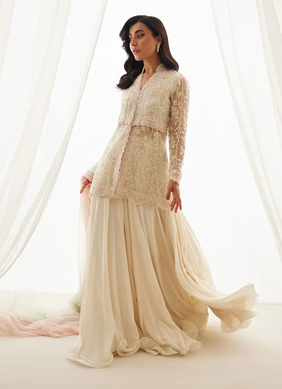Hand-embellished with pearls, Swarovski, and tonal crystals, it balances charm and sophistication on a pristine ivory canvas. Paired with a light-as-air tulle lehenga and a Whimsical net dupatta, it’s the perfect choice for celebrations where you’re destined to shine.