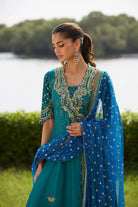 The ensemble is completed with a deep teal tulle dupatta, adorned with scattered sequins and trimmed with an opulent zari border