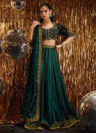 A masterclass in understated glamour — this deep emerald green lehnga choli embodies timeless elegance with a contemporary edge. The velvet blouse features intricate zari motifs and rich zardozi embellishments crafted with kora, dabka, sequins, and crystals, creating a masterful play of texture and light. Paired with a pure raw silk lehnga, adorned with zari borders and motifs around the hem, and narrow zari detailing along each kali, the silhouette flows with graceful grandeur. The pure medium silk dupatta, delicately finished with sequin sprays and zari borders, completes this exquisite ensemble — perfect for winter soirées and festive celebrations alike.