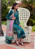 Eileen is a striking ensemble, the shirt is a vibrant hue, decorated with impeccably embroidered unexpected blooms. The striking neckline and borders tie in with the stunning *pure chiffon* dupatta in soothing, refreshing colours ties the whole ensemble together with enviable aplomb. Breeze through the summer in soothing hues and luxe, pure fabrics with Eileen Emerald.