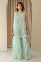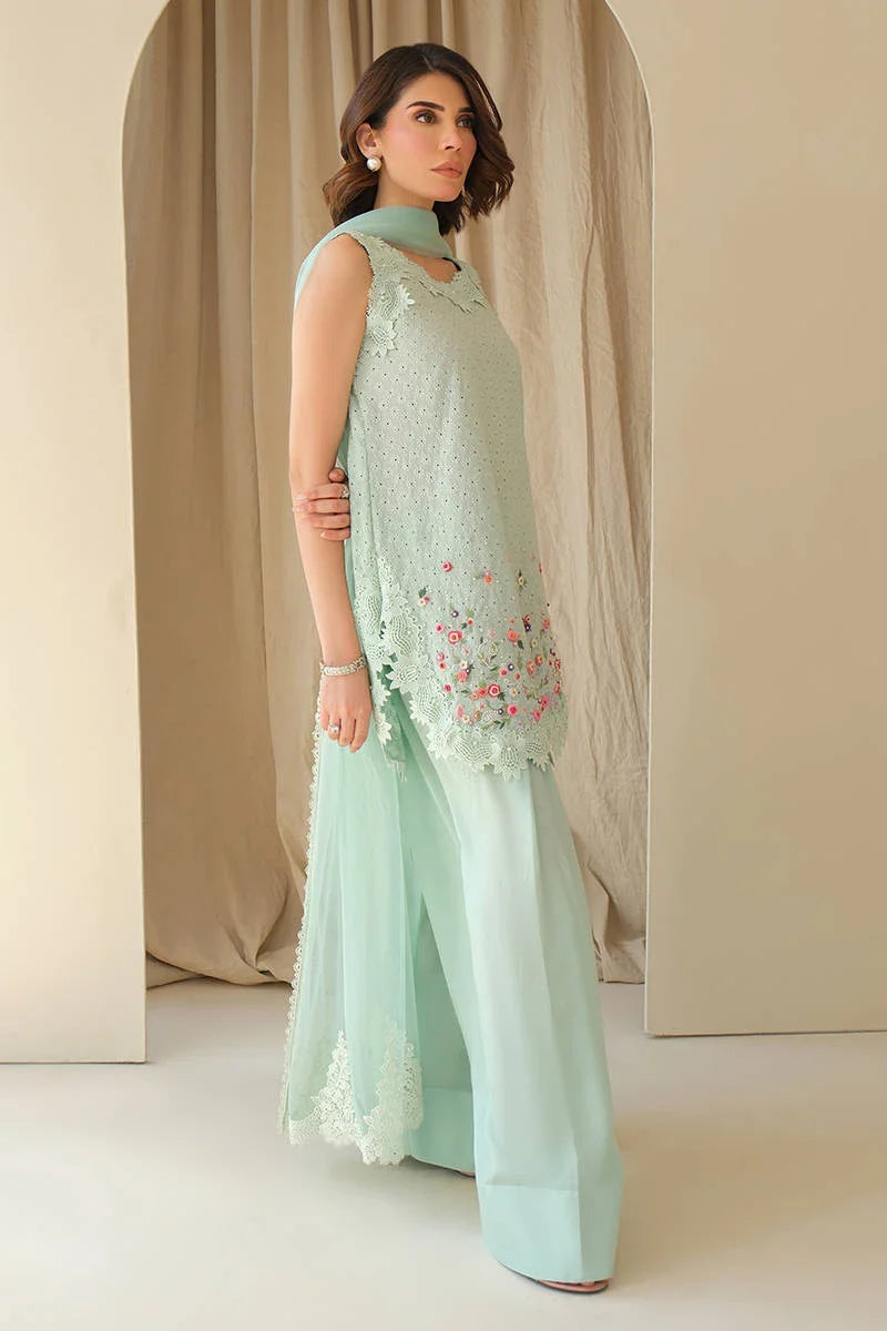 A pastel aqua Cotton eyelet set with the most intricate hand-embroidered French knot florals scattered along the hem. Comes with a scalloped lace Net dupatta and elvish farshi shalwar for graceful, easy elegance.