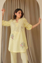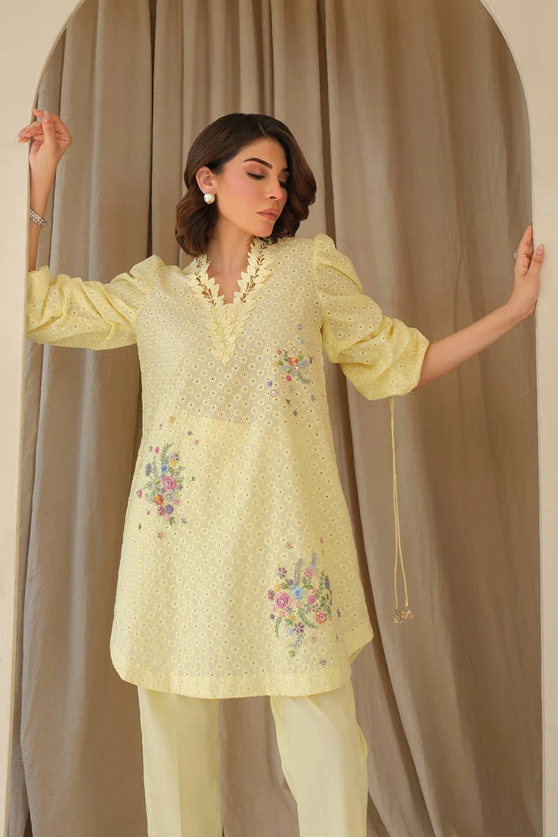 Our signature French knot florals with a hint of sparkle bring this sunshine lemon to life. The crisp Cotton eyelet shirt comes with statement sleeves enhanced with tassels. Comes with Cotton pants.